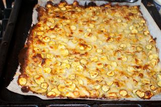 Dovleceii sunt feliați foarte subțire și amestecați cu zahărul, apoi combinați cu restul ingredientelor și copți într-un strat subțire.
